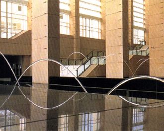 弧形波光水线穿池而出。单而高的喷、小而飘逸的泉,更强化了起伏效果,一种轻灵、腾飞之势呼之欲出,从而增加了亲水性,在流动的水面中创造了不同层次的水景,形成颇具特色的景观。