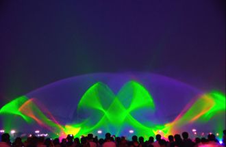 激光,光色纯正,能量集中。利用现代高科技光学振镜技术,在水幕喷头喷出的水幕上形成色彩鲜艳、表演独特的图象、文字、动画。水幕激光表演技术是一种集声、光、电、机、水于一体的技术。